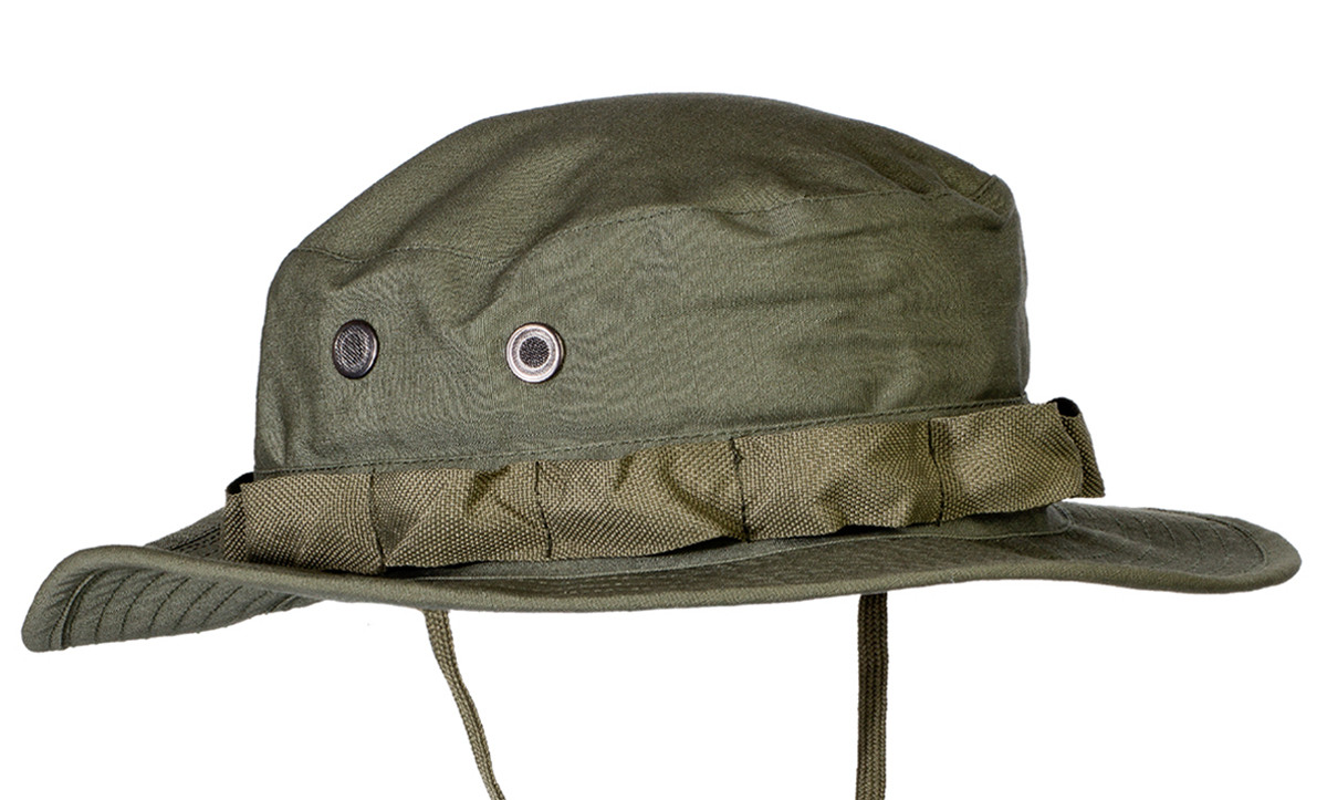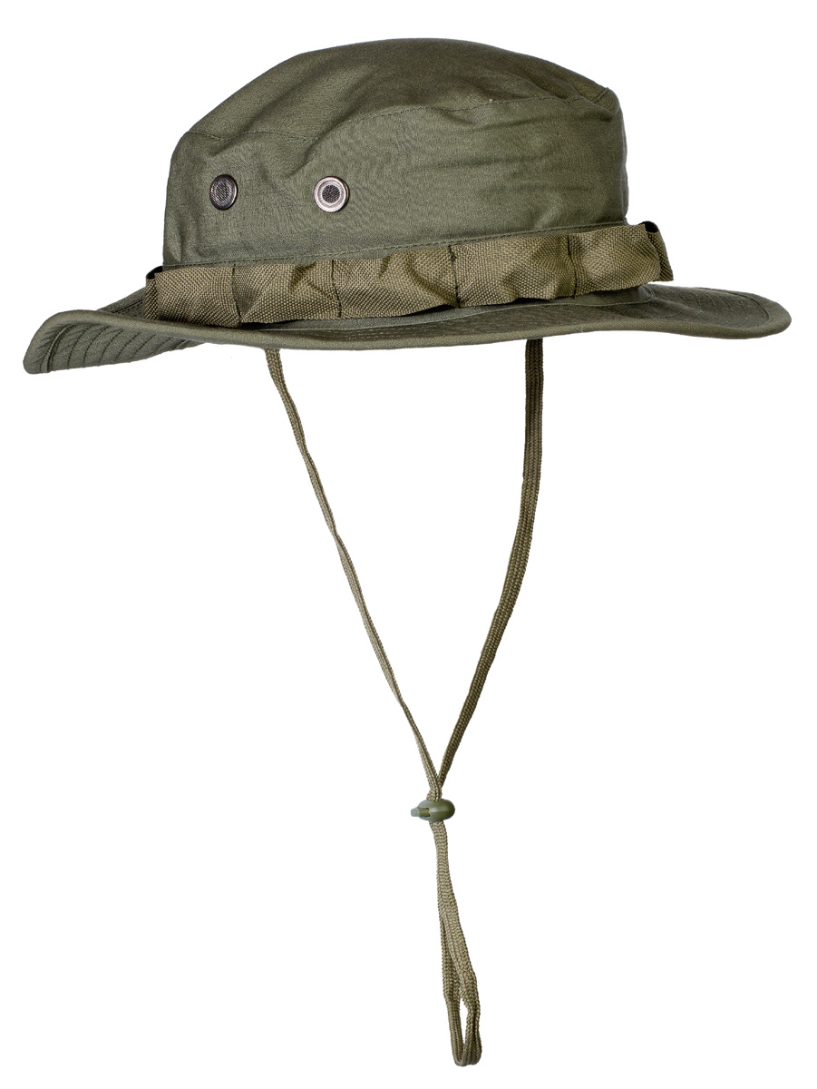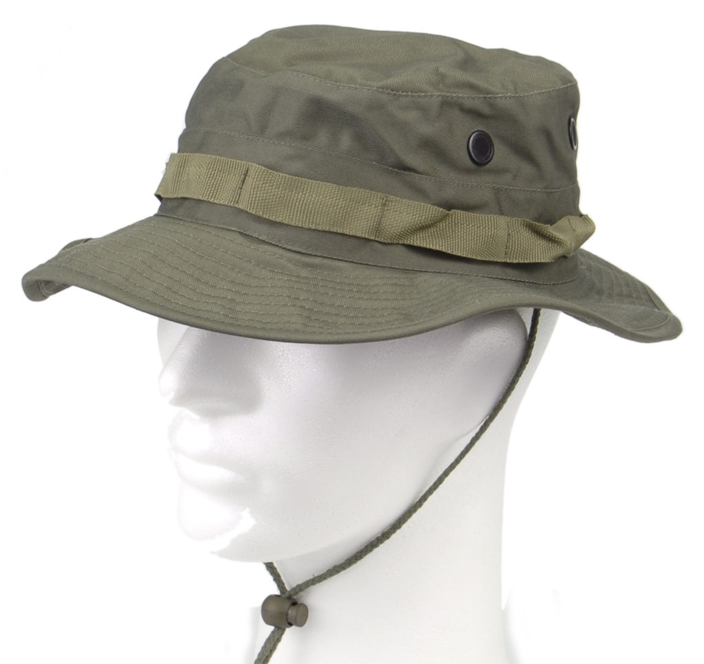 Weicher, zusammenrollbarer Dschungelhut / Schlapphut mit breiter Krempe, seitlichen Belüftungslöchern, Hutband mit abgenähten Schlaufen (zur Aufnahme von Tarnmaterial o.ä.) und Kinn-Kordel. Material: 65% Polyester/35% Baumwolle oder 100% Baumwolle (je nach Verfügbarkeit) in Ripstop-Webung. Marke: Anton Blöchl.