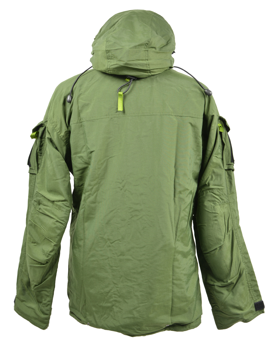 Der Frontreißverschluss ist teilbar und durch eine Druckknopf-Leiste abgedeckt. An den beiden Oberarmen befinden sich flache Taschen mit Klettflächen zum Anbringen von Patches oder Abzeichen.
