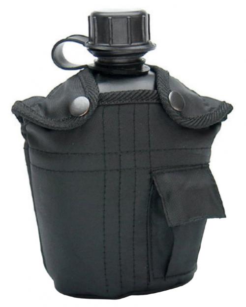 Nachbau der US-GI-Feldflasche (Fassungsvermögen 1L). Die im Lieferumfang enthaltene Feldflaschentasche besitzt ein großes Hauptfach für die Feldflasche, das mittels Druckknöpfen geschlossen wird.