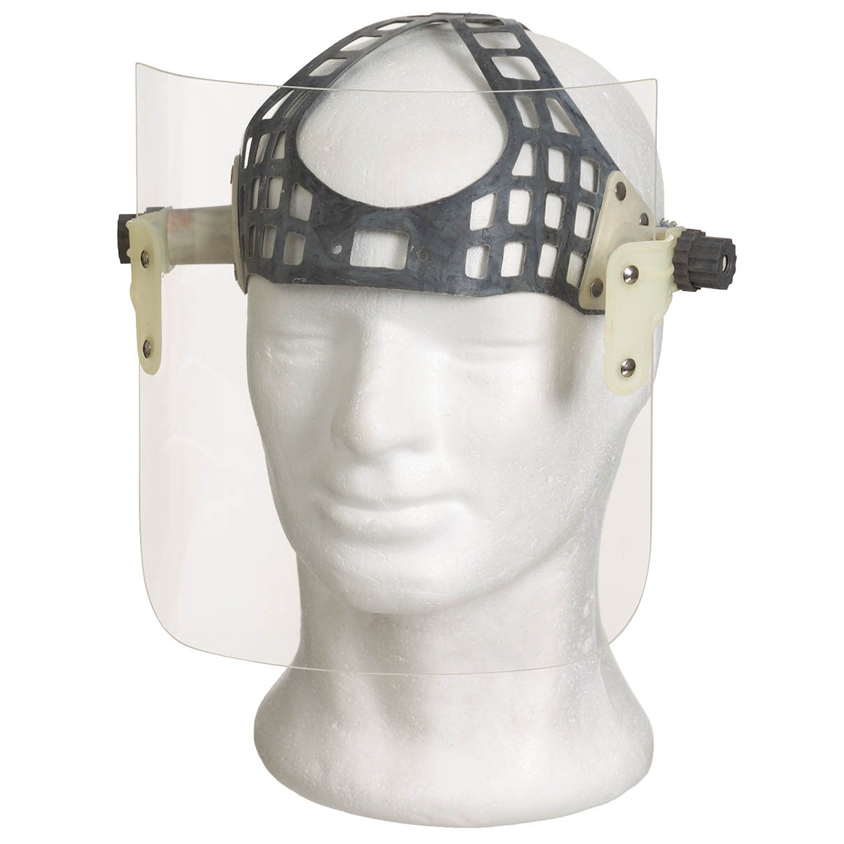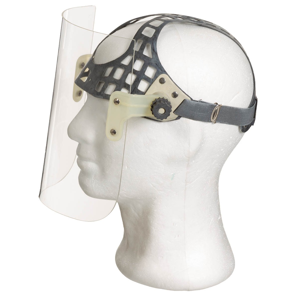 Gesichtsschutz mit fixierbarem, gebogenem Schild und verstellbarem Gummiband. Guter bis sehr guter gebrauchter Zustand (meist nur Lagerspuren vorhanden). Schildgröße: ca. 25 x 21,5 cm (B x H).