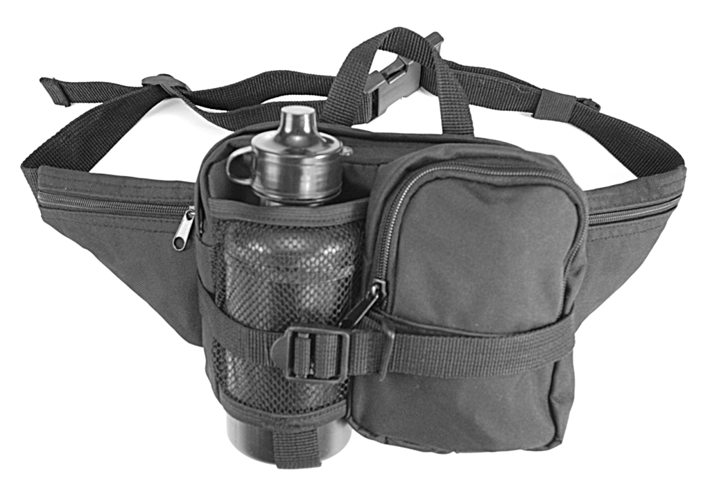 Reißverschluss-Hüfttasche (Volumen ca. 0,7 L) mit verstellbarem Bauchgurt, zwei kleinen Zusatz-Reißverschlusstaschen und einer Netzgewebe-Seitentasche für 0,5-Liter-Trinkflaschen (im Lieferumfang enthalten). Praktisch für leichte Wanderungen oder touristische Unternehmungen.