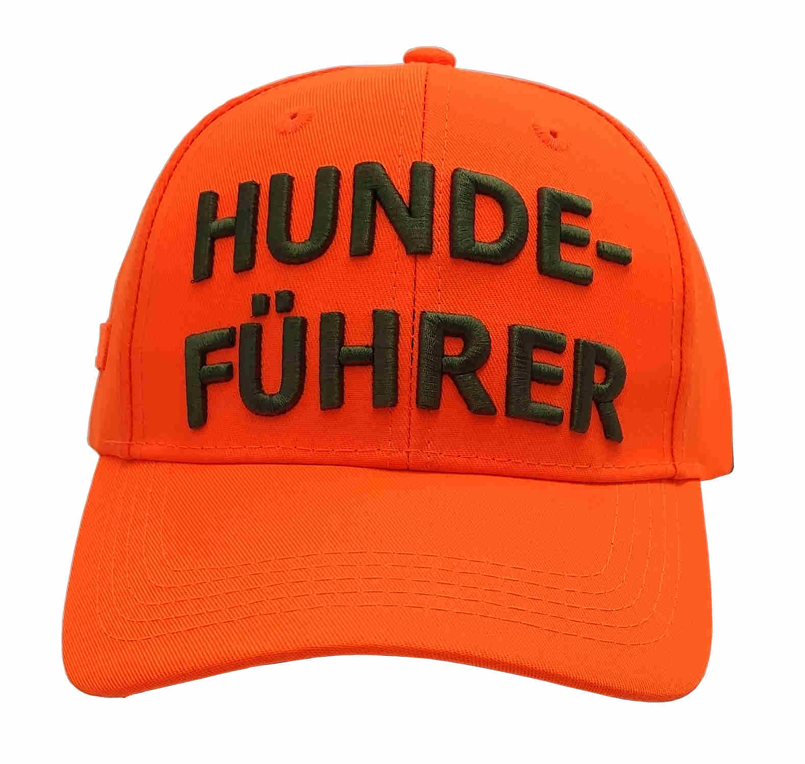 Käppi mit gesticktem Schriftzug "Hundeführer". Einheitsgröße; mit Weitenregulierung am Hinterkopf. Farbe: Signalorange für gute Sichtbarkeit. Material: 100% Polyester.
