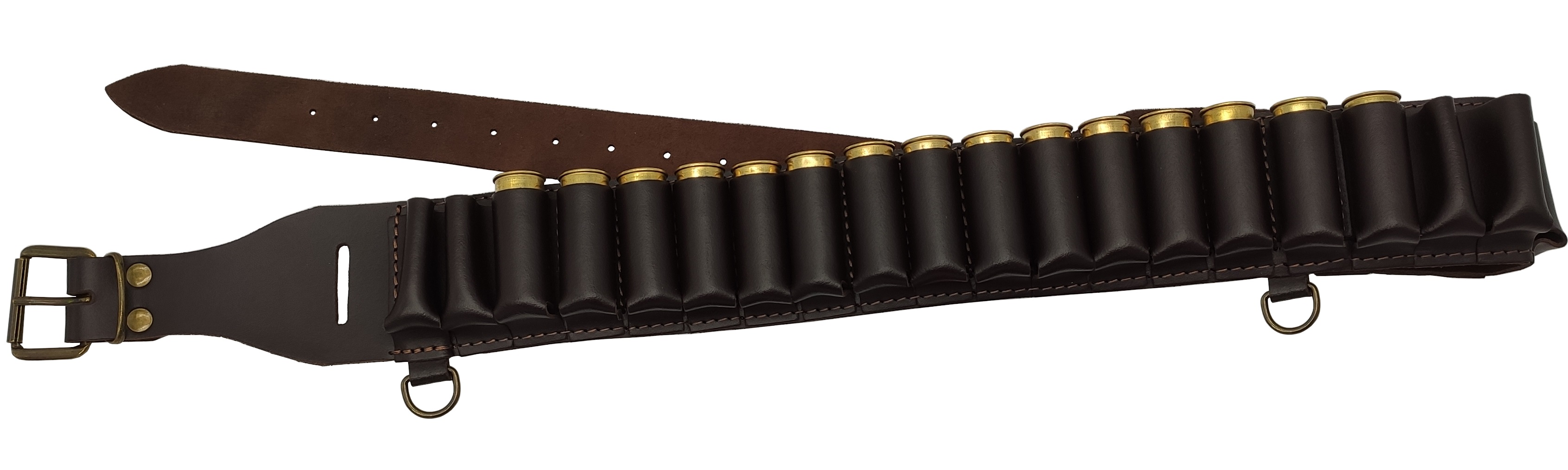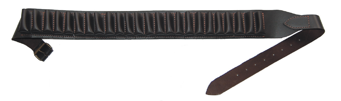 Hochwertiger Patronengürtel aus braunem Rindleder mit 24 geschlossenen Schlaufen für Schrotpatronen (Kaliber 12/16/20). Achtstufig einstellbar. Länge: 118 cm, Breite 6,5 cm.