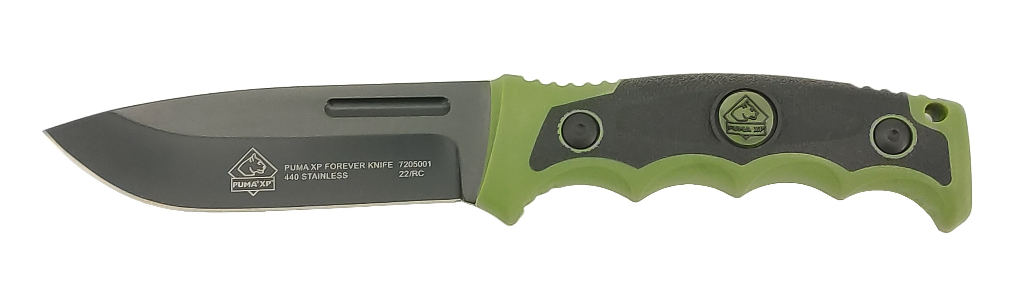 Das PUMA XP Forever Survivalmesser ist der perfekte Begleiter für Outdoor-Enthusiasten: Die schwarz beschichtete Klinge ist aus zähem, korrosionsbeständigem 440C Stahl gefertigt; der Griff liegt dank ausgeprägten Fingermulden und rutschfester Gummierung bequem und sicher in der Hand - auch in feuchtem Zustand.
