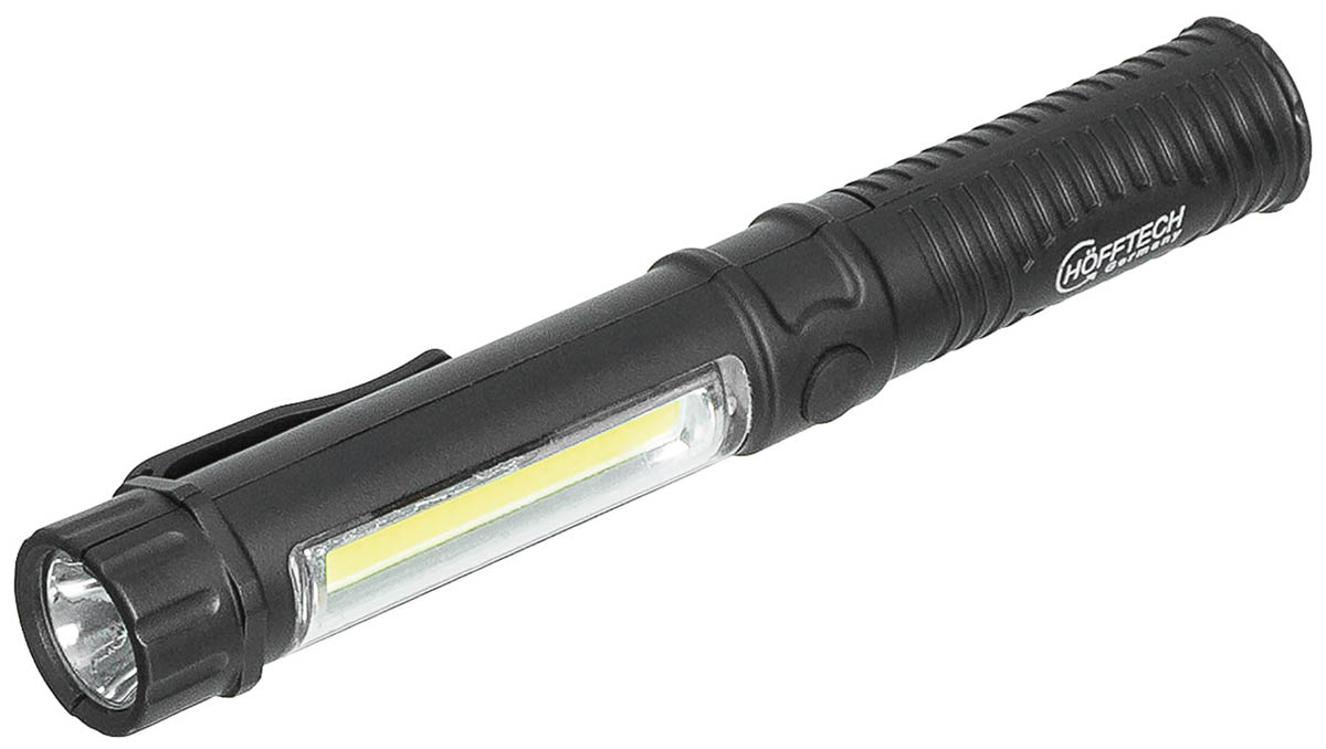 Die HÖFFTECH LED-Stablampe "Slim" ist eine vielseitige Arbeitsleuchte, die sich ideal für verschiedene Anwendungen eignet. Mit einer leistungsstarken weißen LED (1 Watt) an der Vorderseite und einer seitlichen LED (1,5 Watt) bietet sie eine beeindruckende Helligkeit von 300 Lumen. Das robuste Kunststoffgehäuse sorgt für Langlebigkeit, während das magnetische Griffende und der Gürtelclip zusätzlichen Komfort bieten. Die Lampe hat eine kompakte Länge von ca. 16,5 cm und einen Durchmesser von ca. 2,5 cm. Sie wird mit 3 AAA-Batterien betrieben (nicht enthalten) und ist somit perfekt für den Einsatz zu Hause, in der Werkstatt oder unterwegs.