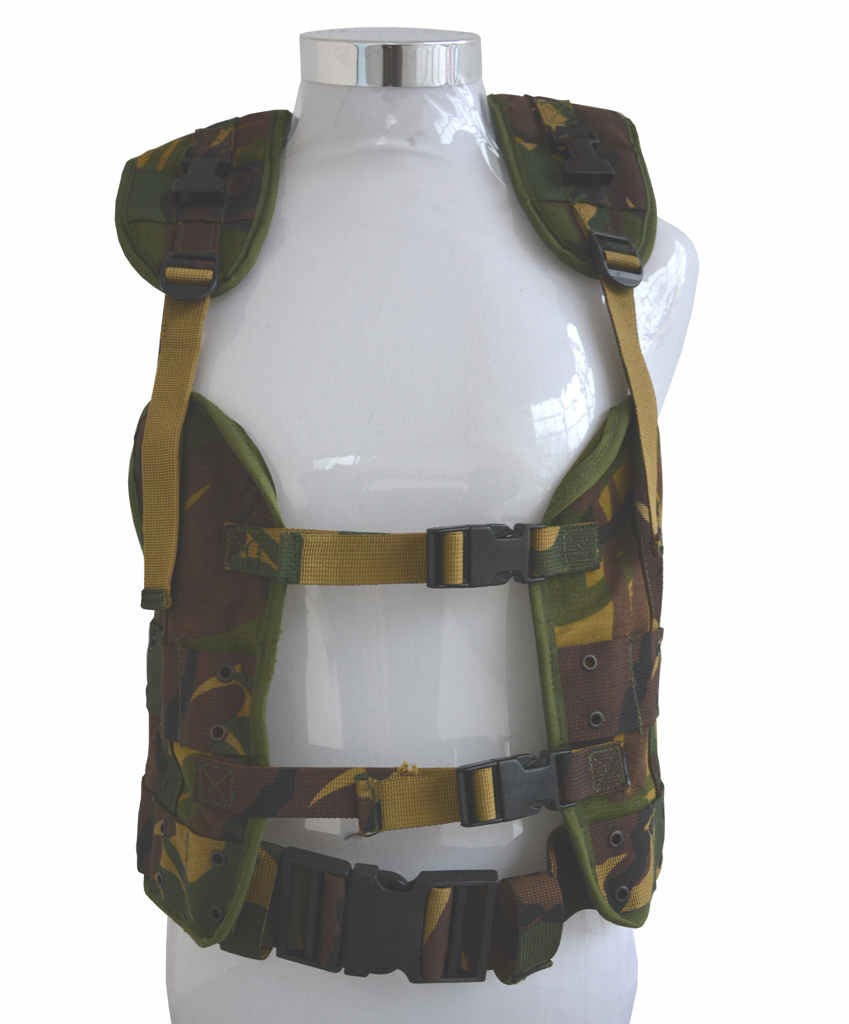 Trageweste der niederländischen Armee mit DPM-Tarn-Muster in gebrauchtem Zustand. Aus robustem Nylon-Gewebe; die Metallösen erlauben das Anbringen von Taschen mittels ALICE-Clips.