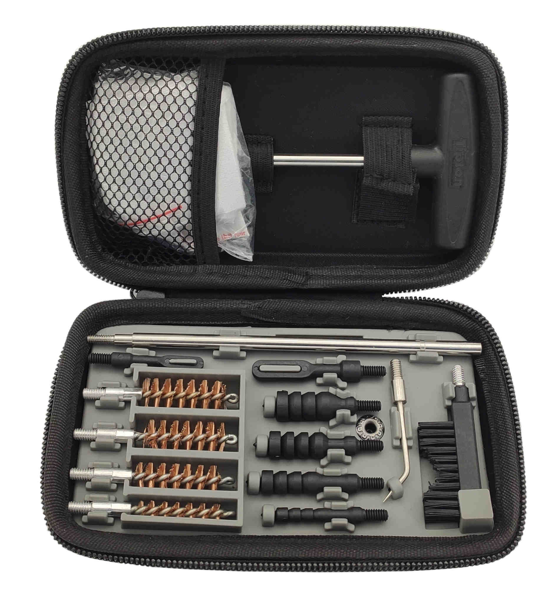 Kompaktes Reinigungsset für Kurzwaffen aller gängier Kaliber, untergebracht in einem gut organisierten Reißverschluss-Etui.
